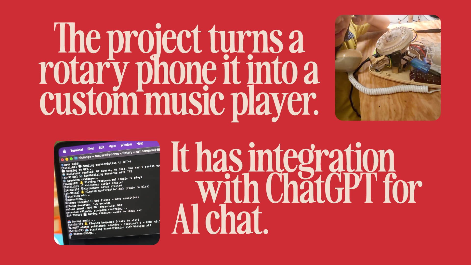 This project revives an old rotary phone, retaining the digits as command. This version turn it into a music player and also an AI voice chat.The reset button is triggered when the phone handle is placed or when the front button is pressed.The AI chat uses ChatGPT voice model, Whisper API to transcibe and Google TTS to reply. I need to swap up the speaker and microphone with USB Sound Card as it's easier to install for the Raspberry Pi, also the audio quality is much better.